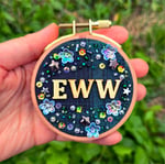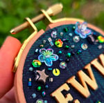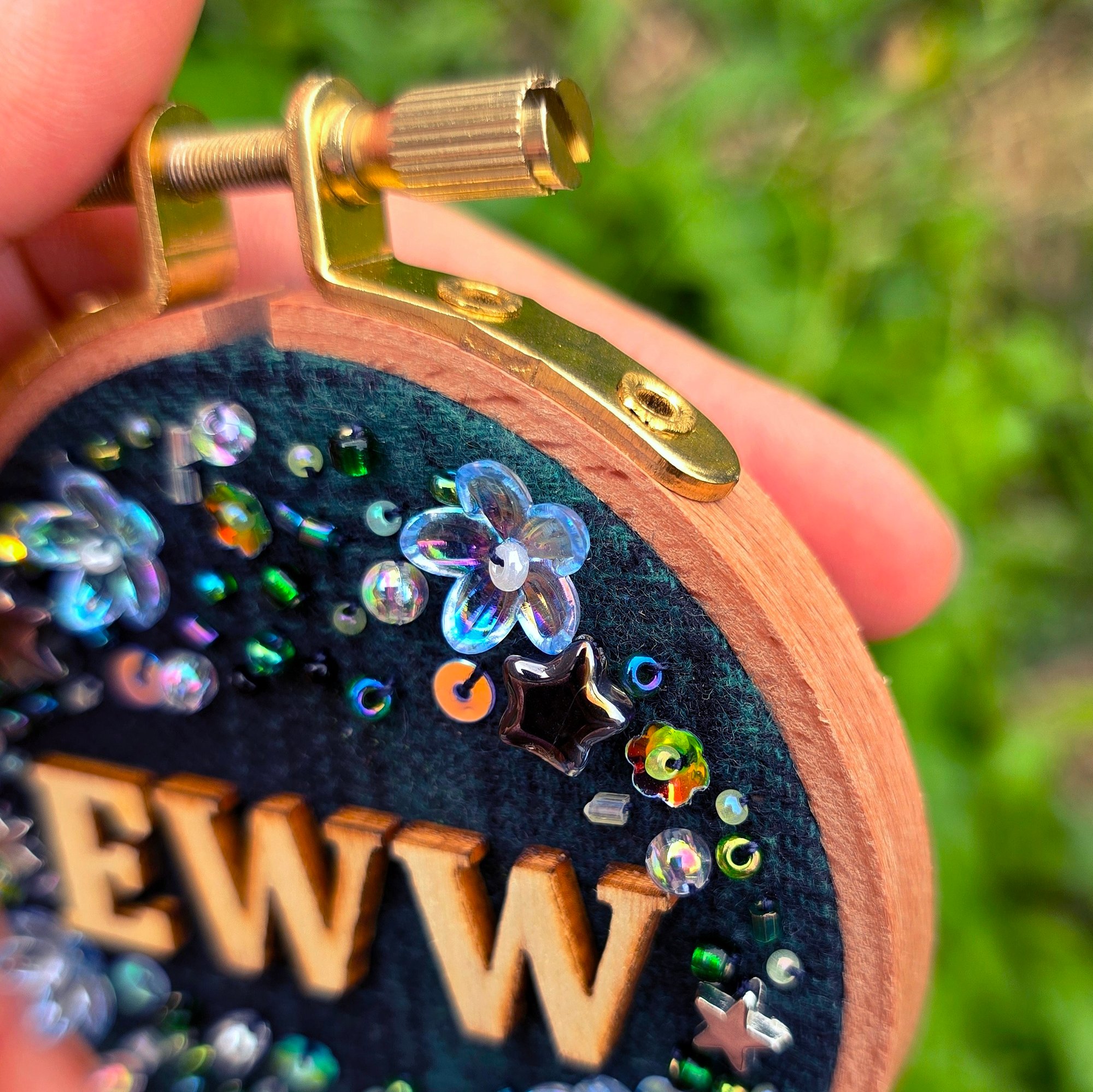 Made with a mix of glass and acrylic beads and sequins, on tartan cotton fabric. The hoop measures 8cm in diameter and is finished with felt and a leather tag with "Studio Ansitru" on the back.