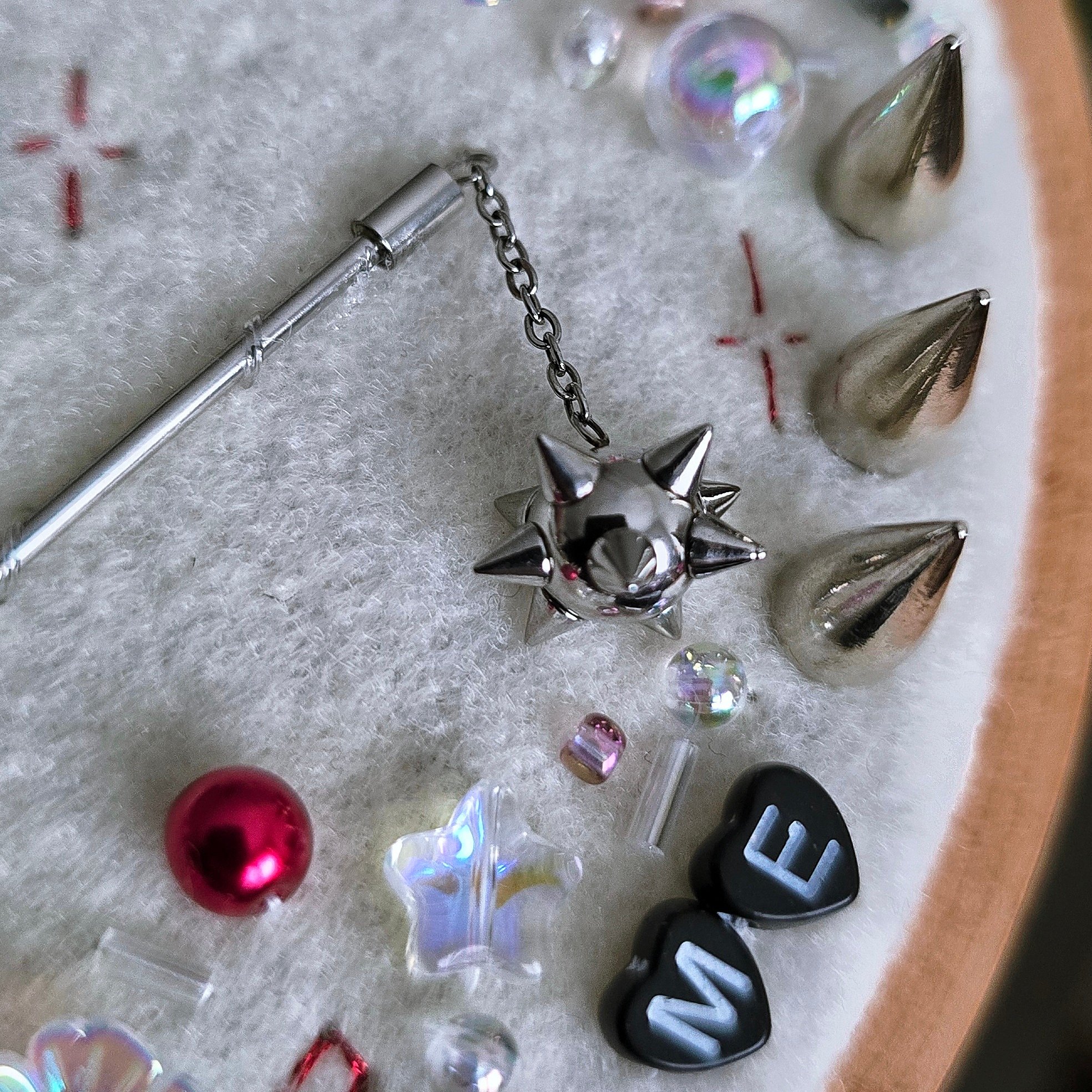 Made with a mix of glass and acrylic beads and sequins, as well as a small sword and flail and metal studs, embroidered on felt fabric. The hoop measures 16.5cm in diameter, and is finished with felt and a leather tag with "Studio Ansitru" on the back.