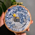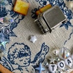Made with a mix of glass and acrylic beads, a miniature toaster and sequins, embroidered on toile de jouy cotton fabric.