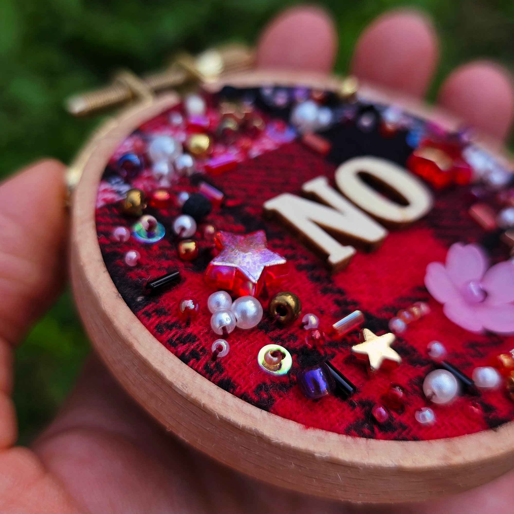 Made with a mix of glass and acrylic beads and sequins, on tartan wool fabric. The hoop measures 8cm in diameter and is finished with felt and a leather tag with "Studio Ansitru" on the back.