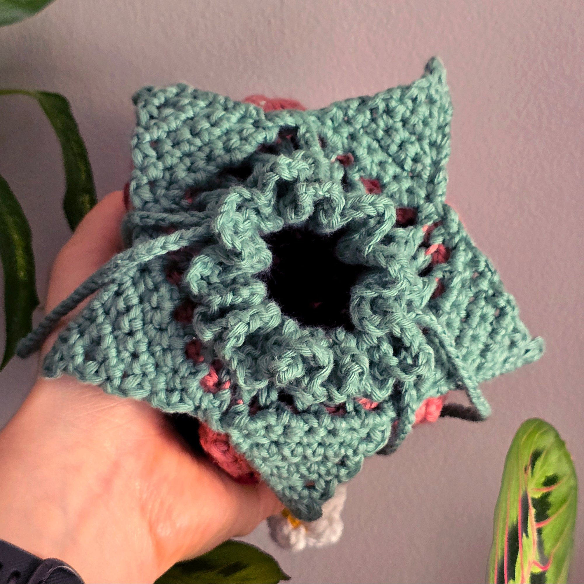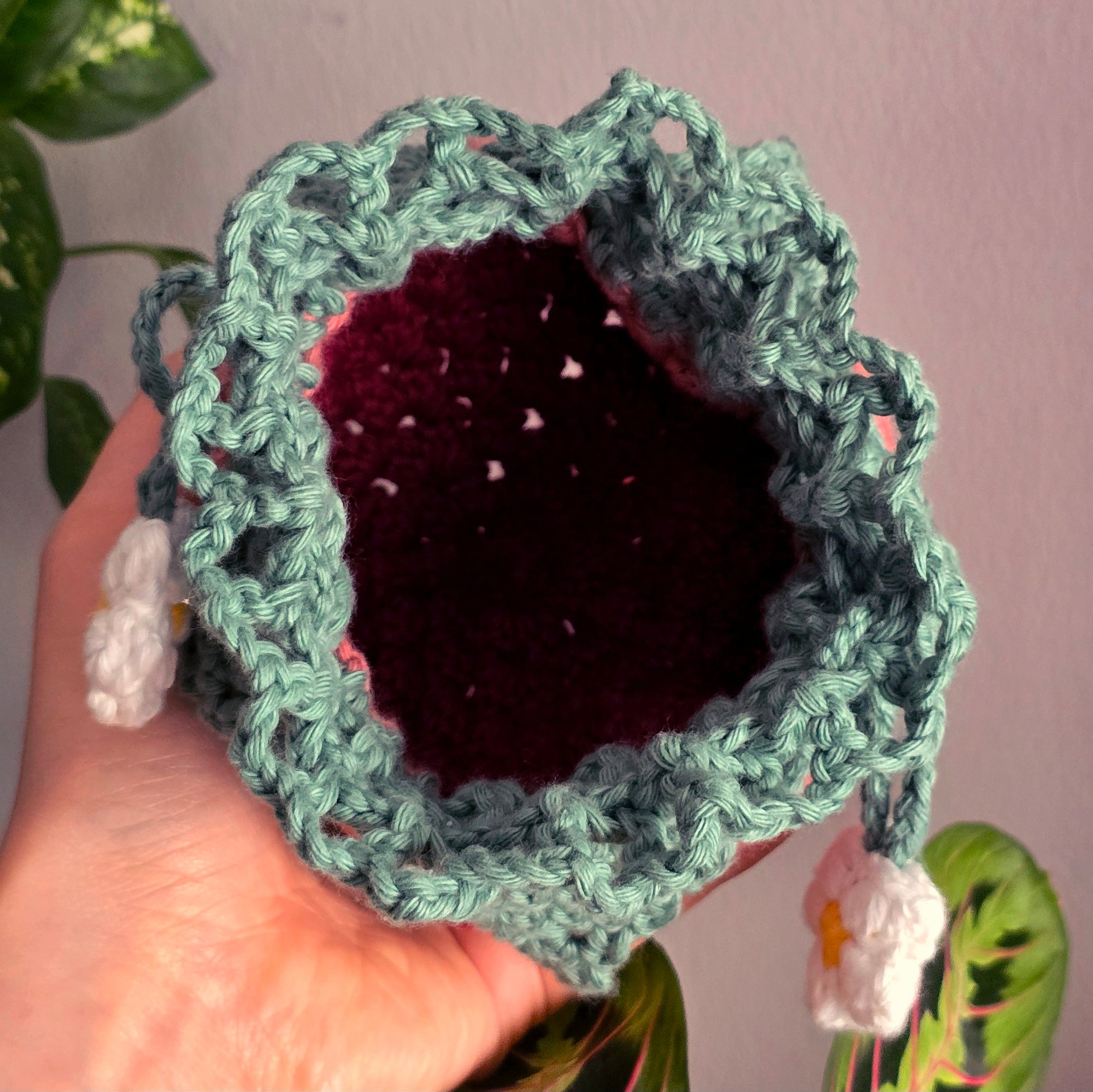 The trinket bag is made with 100% 6/8 cotton yarn.
