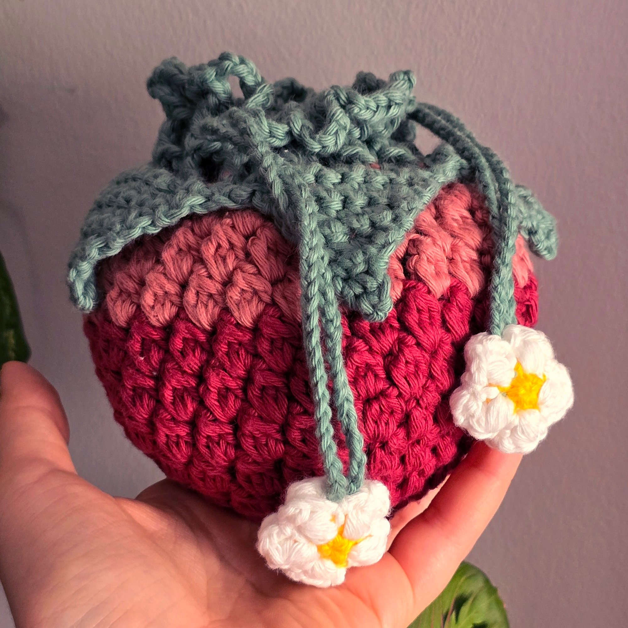 š The bag measures 15cm wide by 15cm tall (measured flat, and features a pull-to-close mechanism with strawberry blossoms at the end.